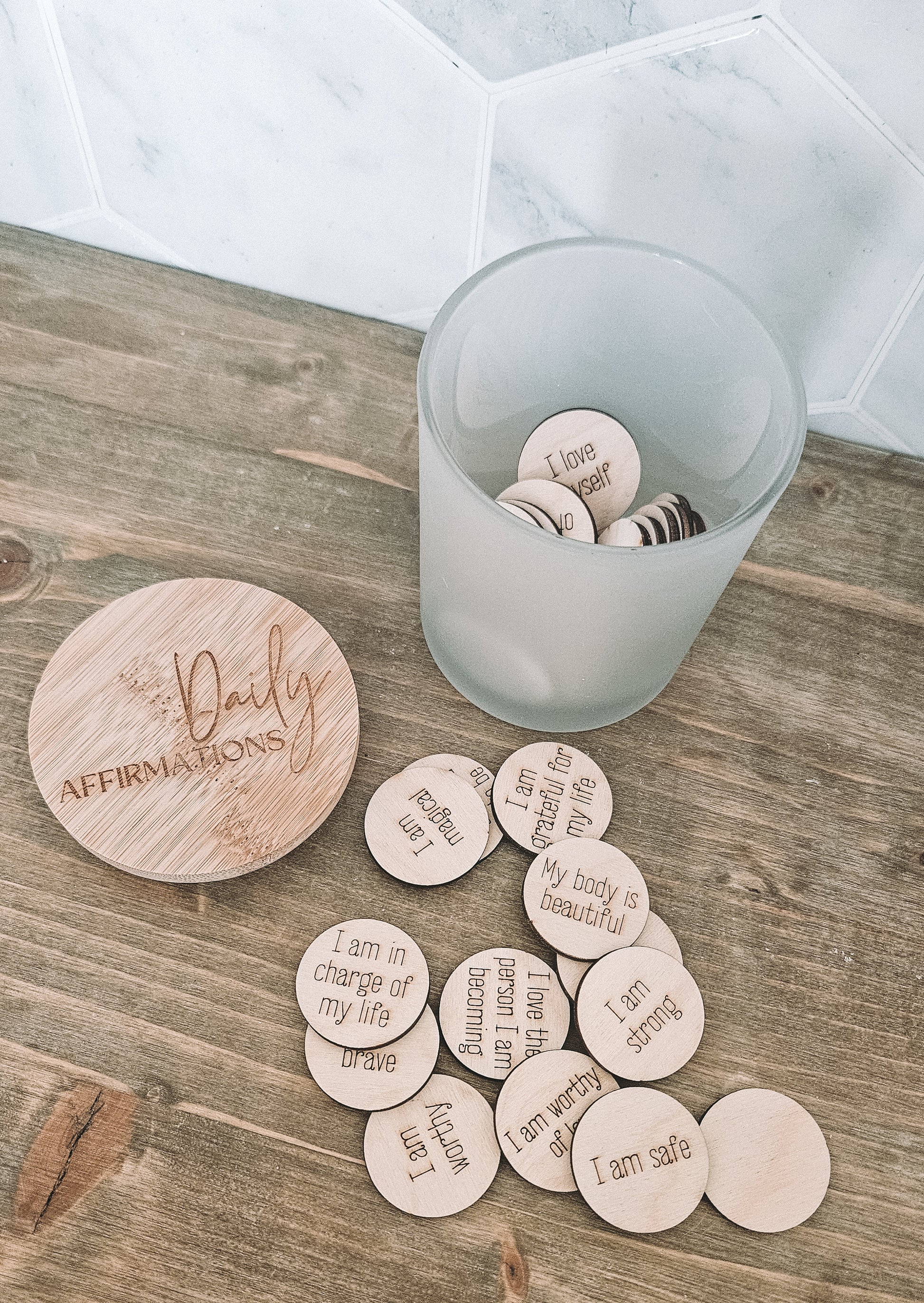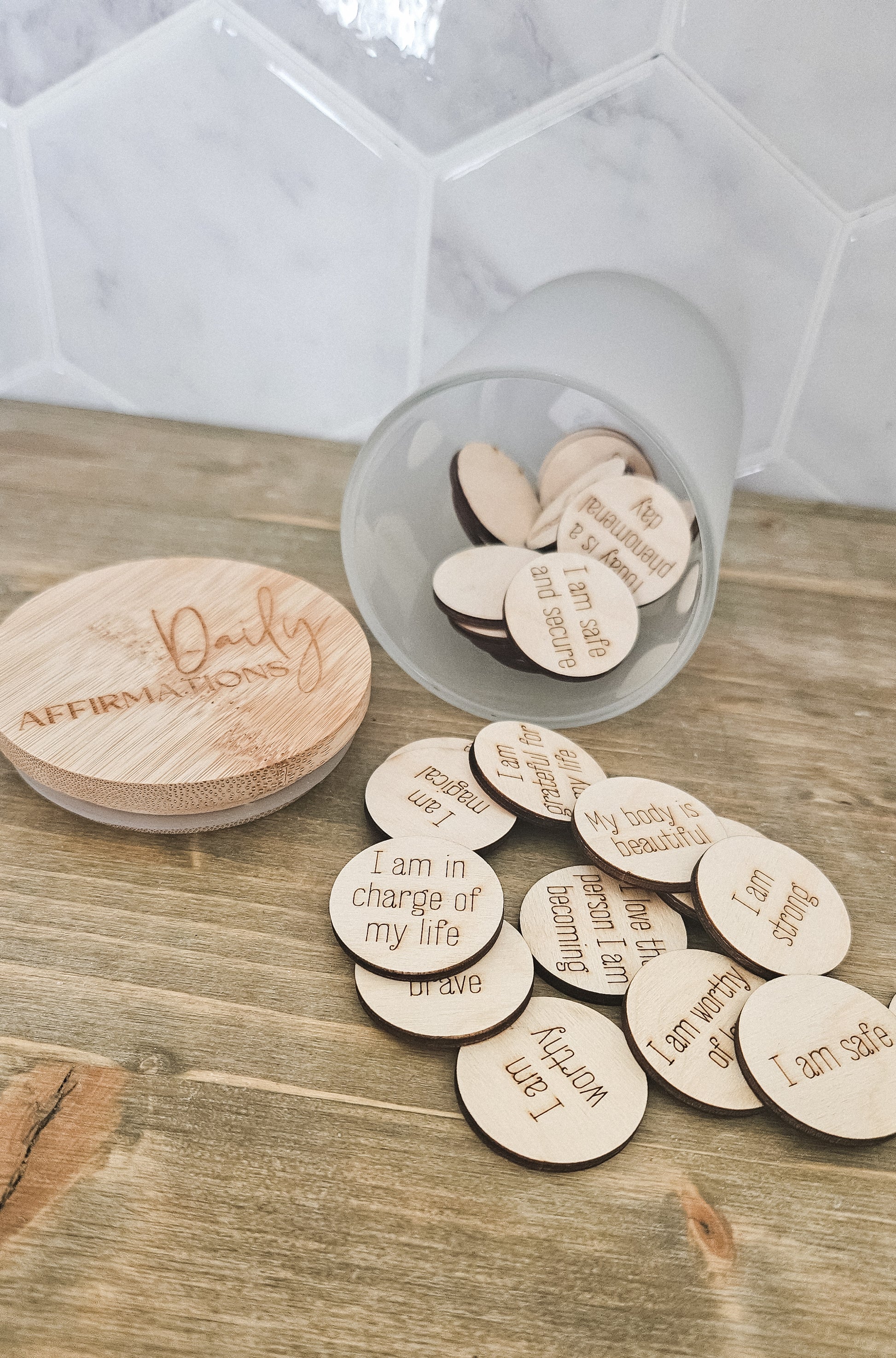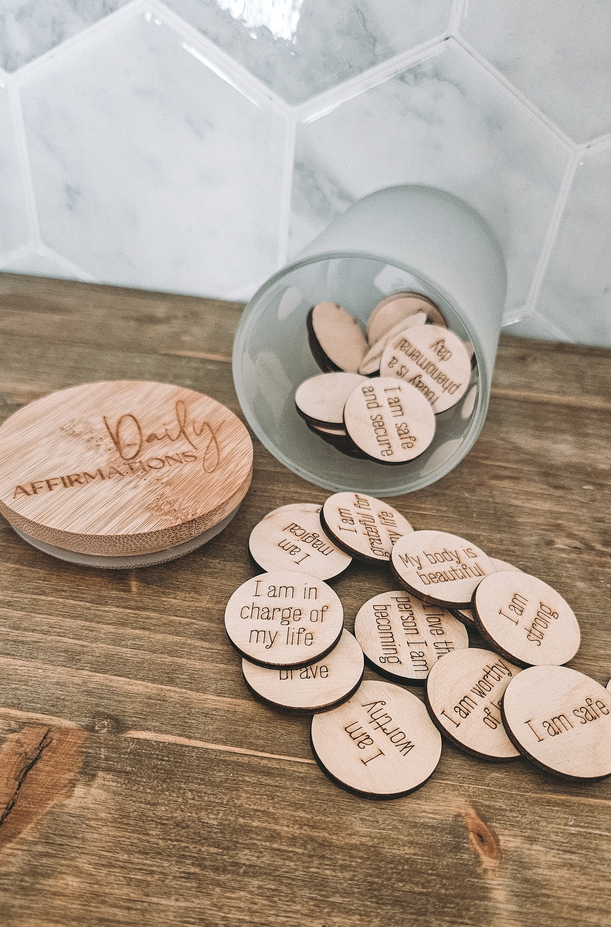 Boost your daily mindset with our must-have Daily Affirmations Jar. Our best seller includes 25 heart-shaped affirmations made of 1/8" Baltic Birch and 5 customizable tokens. The jar is made of glass and engraved bamboo, making it a perfect gift for yourself or a loved one.